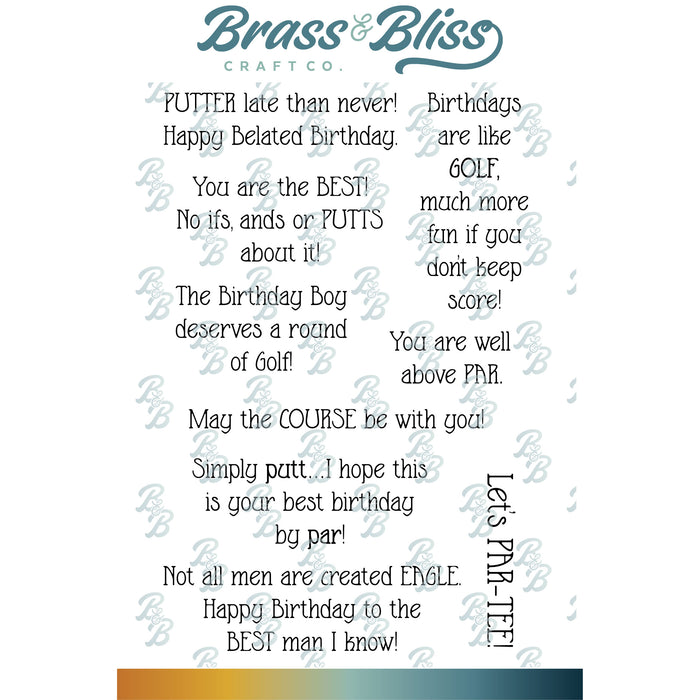 Elevate your golf game with the 37030 Par-Tee Time - 4x6 Stamp Set! This set features 9 golf themed sentiments, including "Putter late than never" (2.4" x .6") and "Simply PUTT" (2.45" x .93"). Perfect for adding a personalized touch to invitations, cards, and more. Fore!